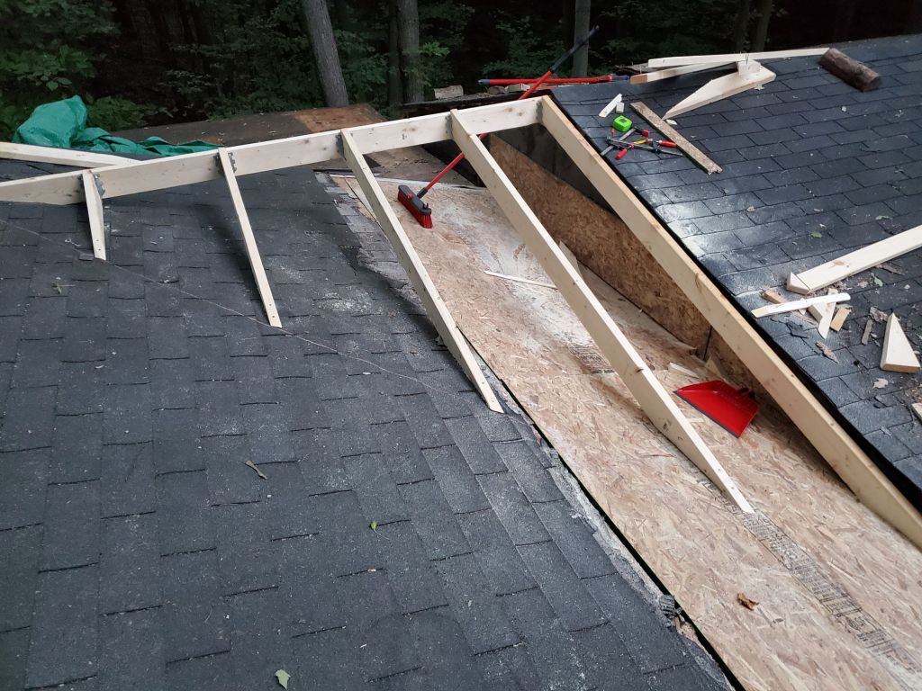 I’m not a professional roofer and didn’t really do this part correctly. I would have been fine if I was only dealing with the two ridge lines. Unfortunately, the porch roof handed me an issue I never really dealt with correctly. The porch roof starts above the roof line on the left, which created a low spot where the two met. I redid the framing in the picture above to be higher, but I still didn’t extend it far enough and just created another problem (see below).