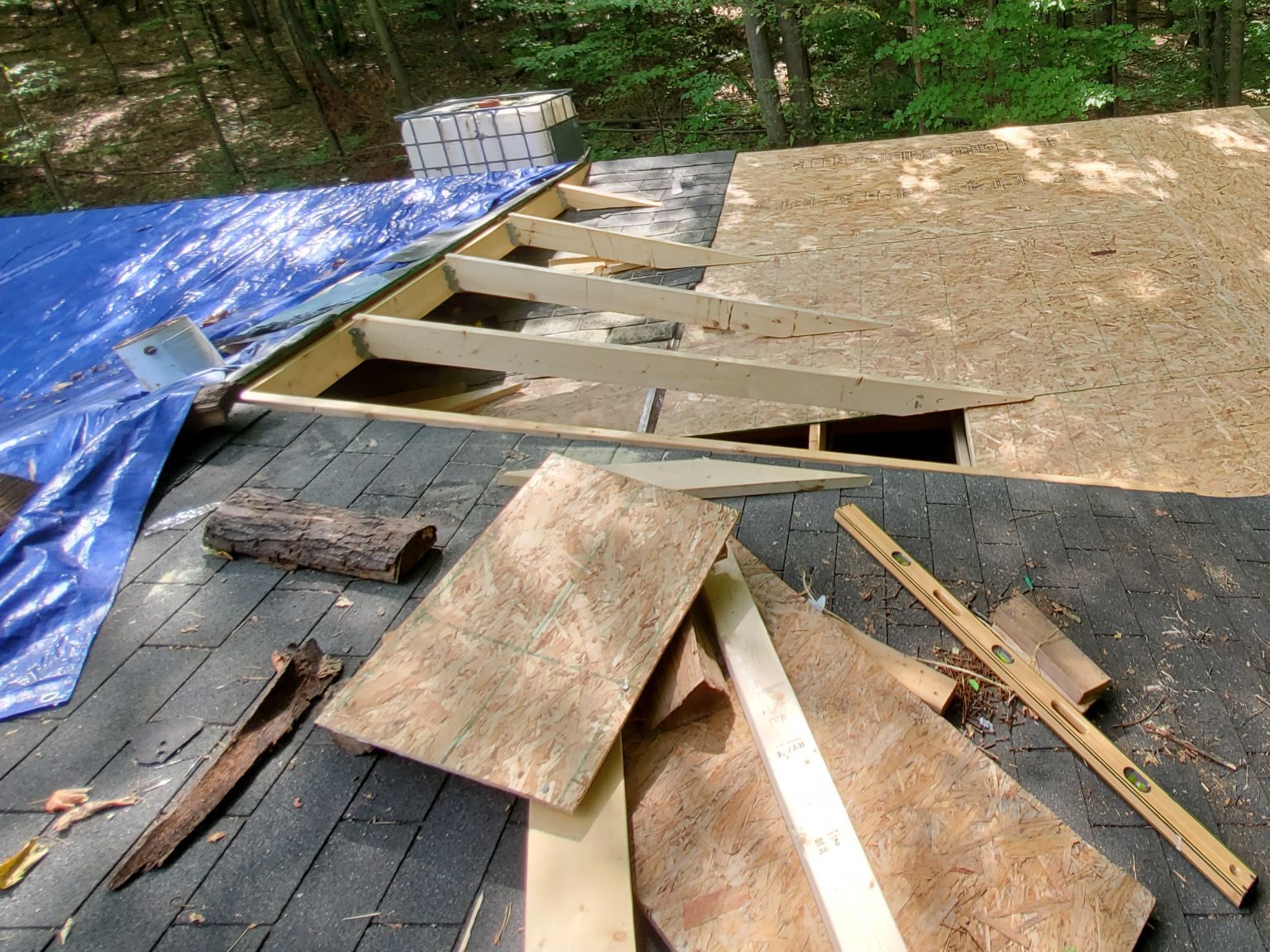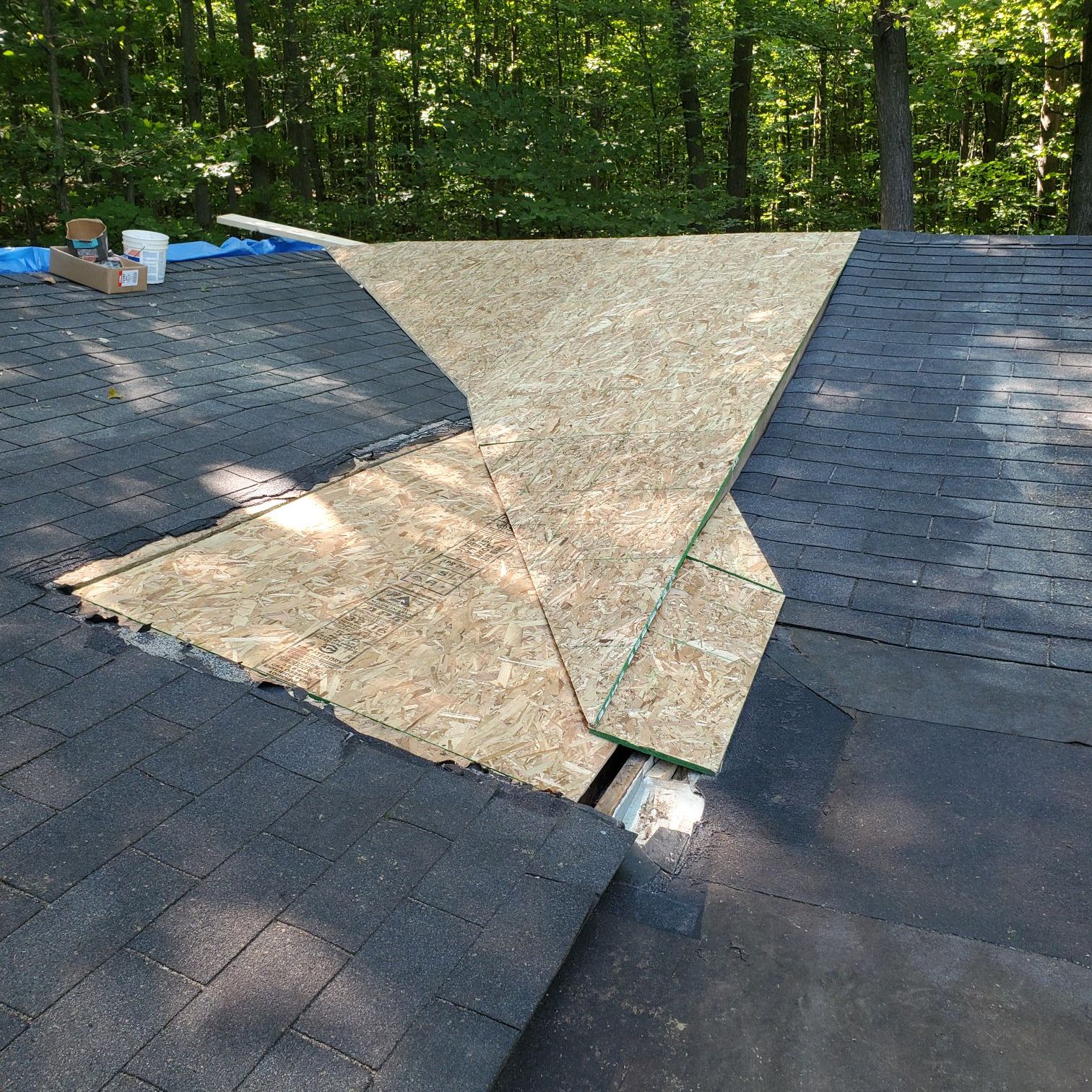 I knew I was going to put on a metal roof the next summer so I covered up the whole with sheet metal and covered up the section I had “fixed” with tar paper and crossed my fingers.