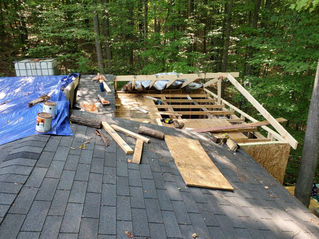 The roof extension went much better. That is once the rain stopped! I mentioned that I was working on this project over the coarse of about seven weeks, and rain is not your friend when you are working on a roof. At one point the flat roof was ripped off and the only thing keeping the elements out were the existing web left from the roof and a tarp.